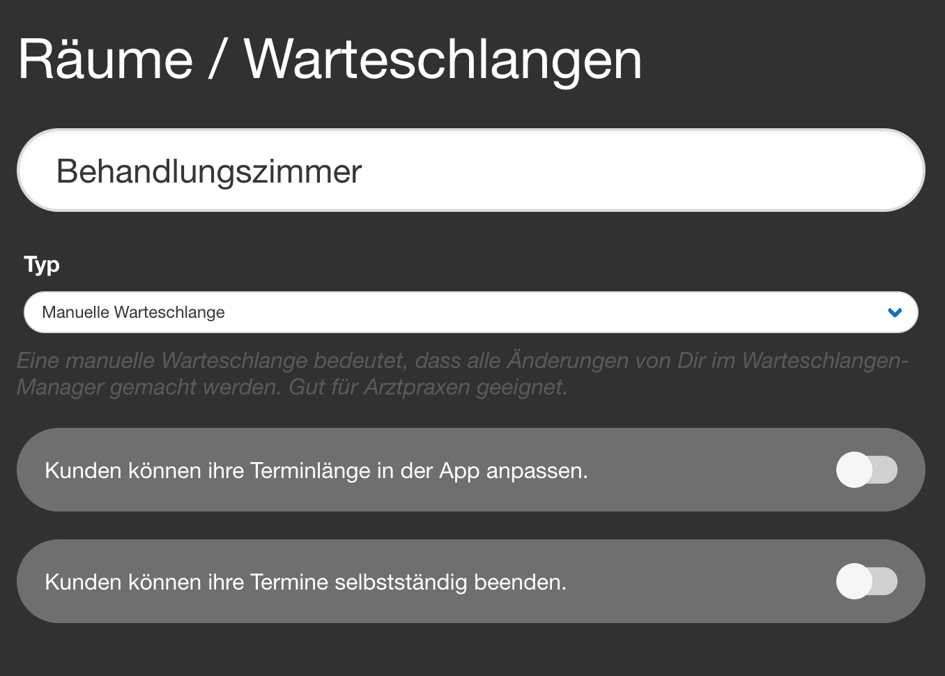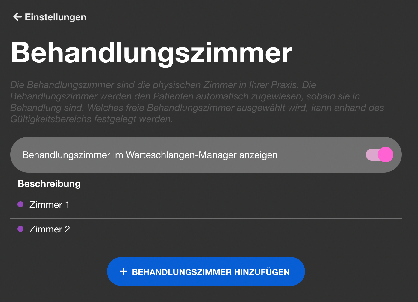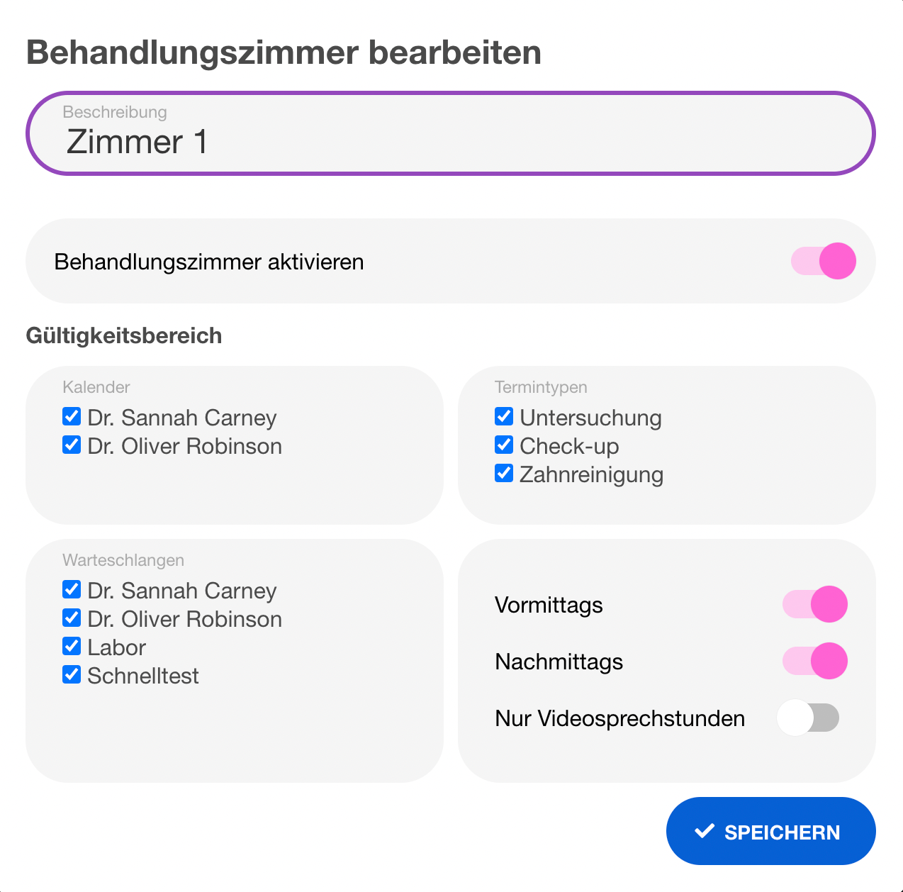 | 7 | ![]() | Treatment room edit dialog | Room edit with validity scope (queue/time restrictions). Recapture showing a configured room. | |