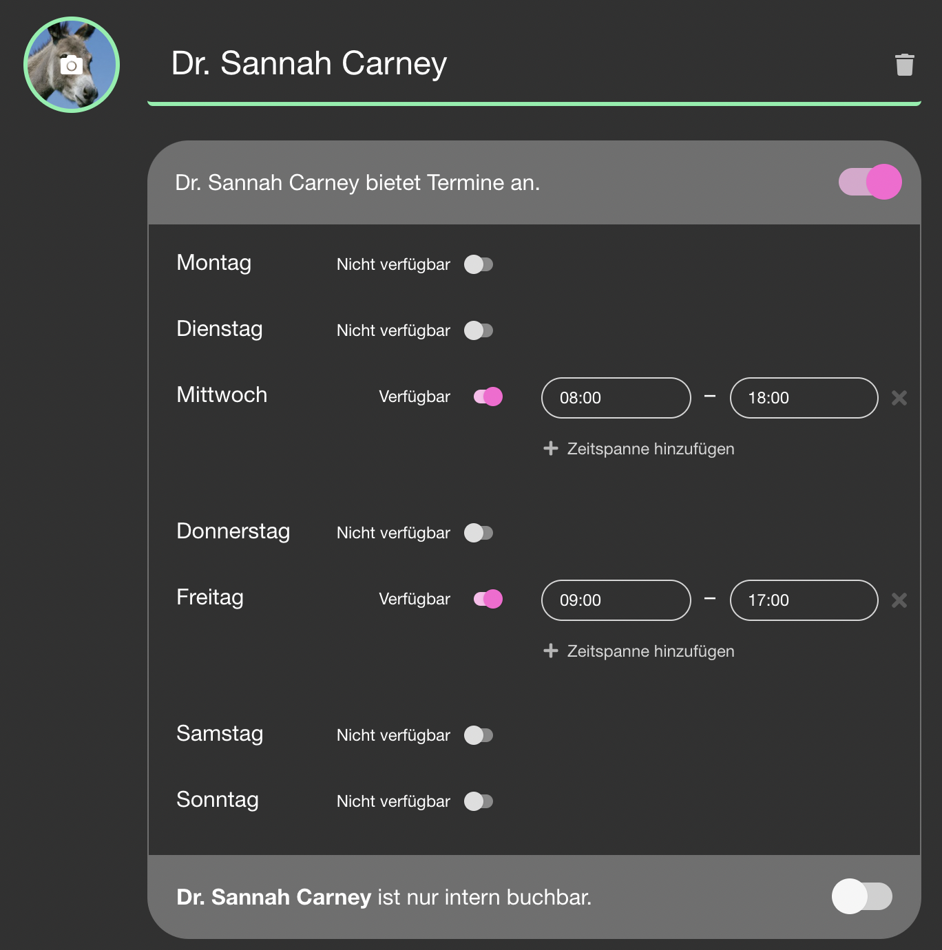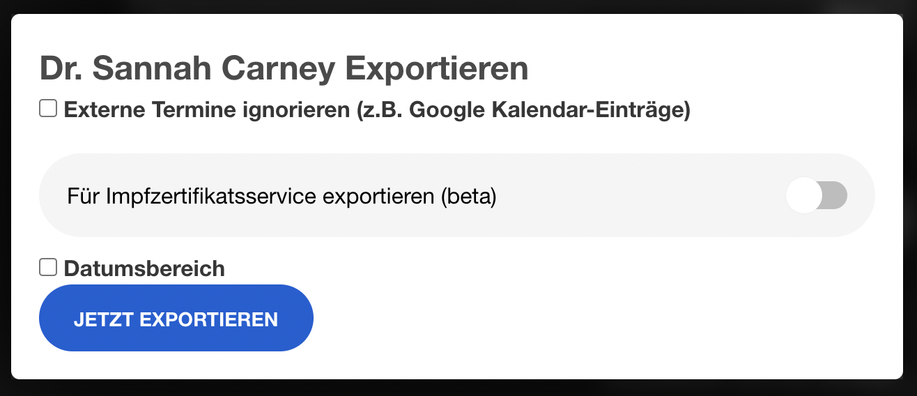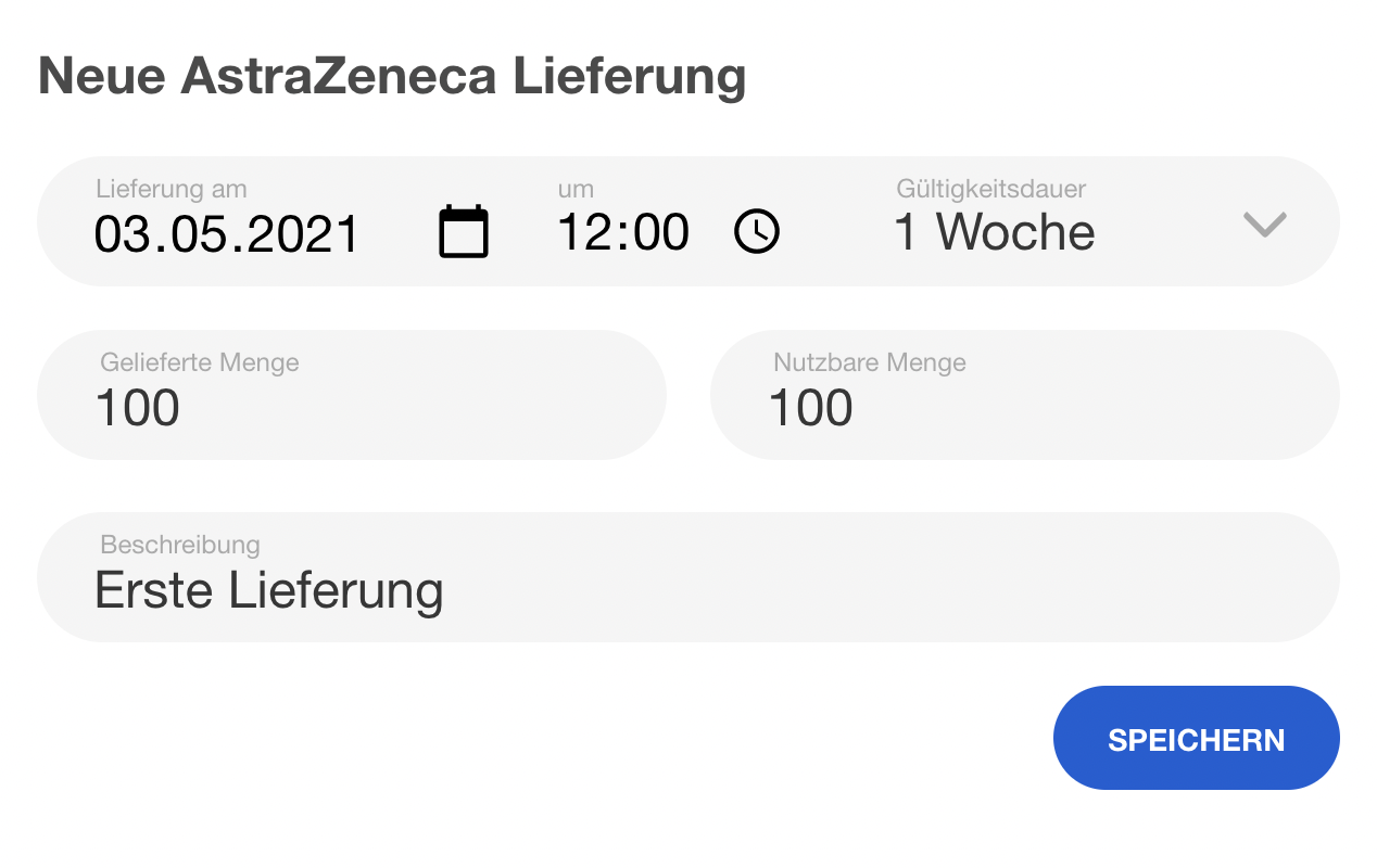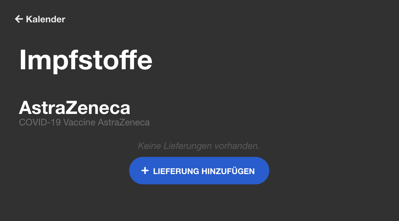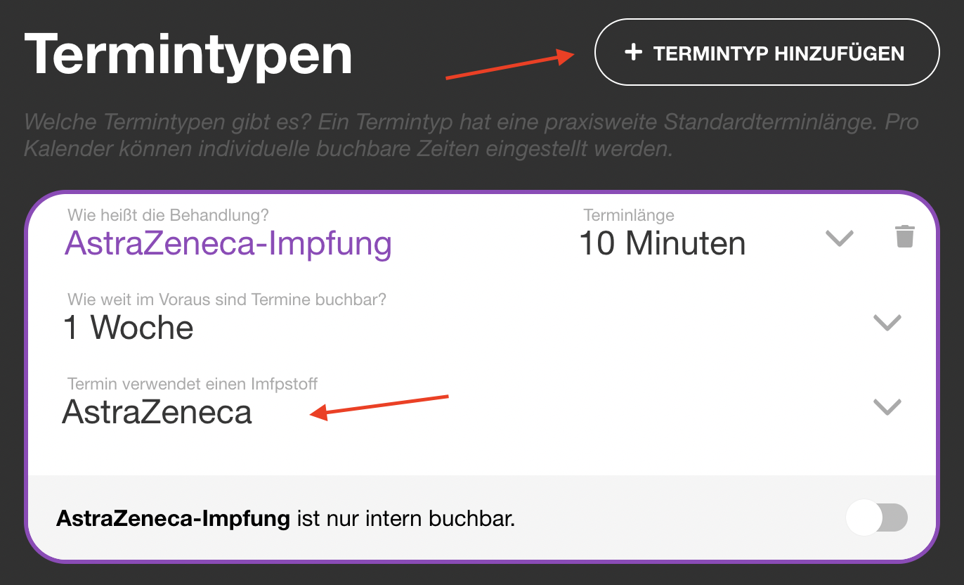 | 53 | ![]() | Appointment type with vaccine | Type config with "Termin verwendet einen Impfstoff" toggle. Could be recaptured as part of general Termintypen screenshots. | |
