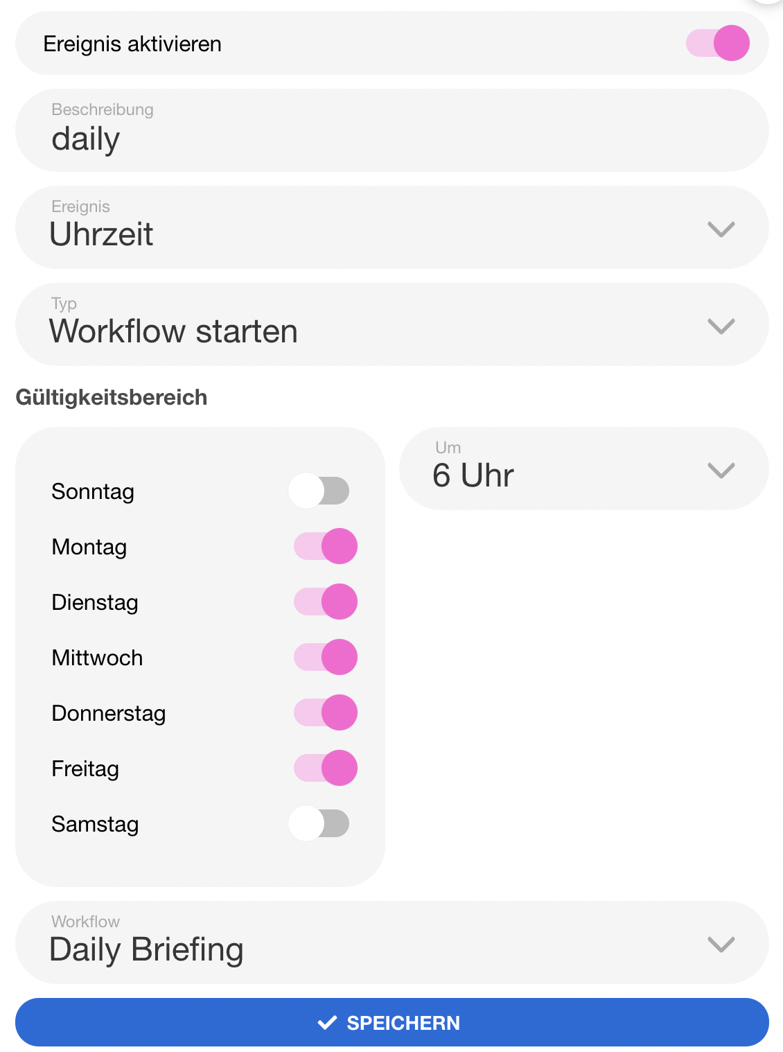 | 78 | ![]() | Daily briefing event trigger | Event set to "Uhrzeit" triggering the workflow. Recapture alongside #76 since similar UI. |