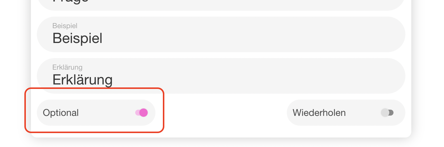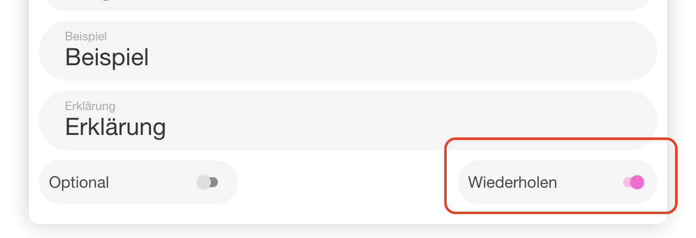 | 86 | ![]() | Repeatable question toggle | Form editor showing "wiederholen" toggle. Recapture. | |