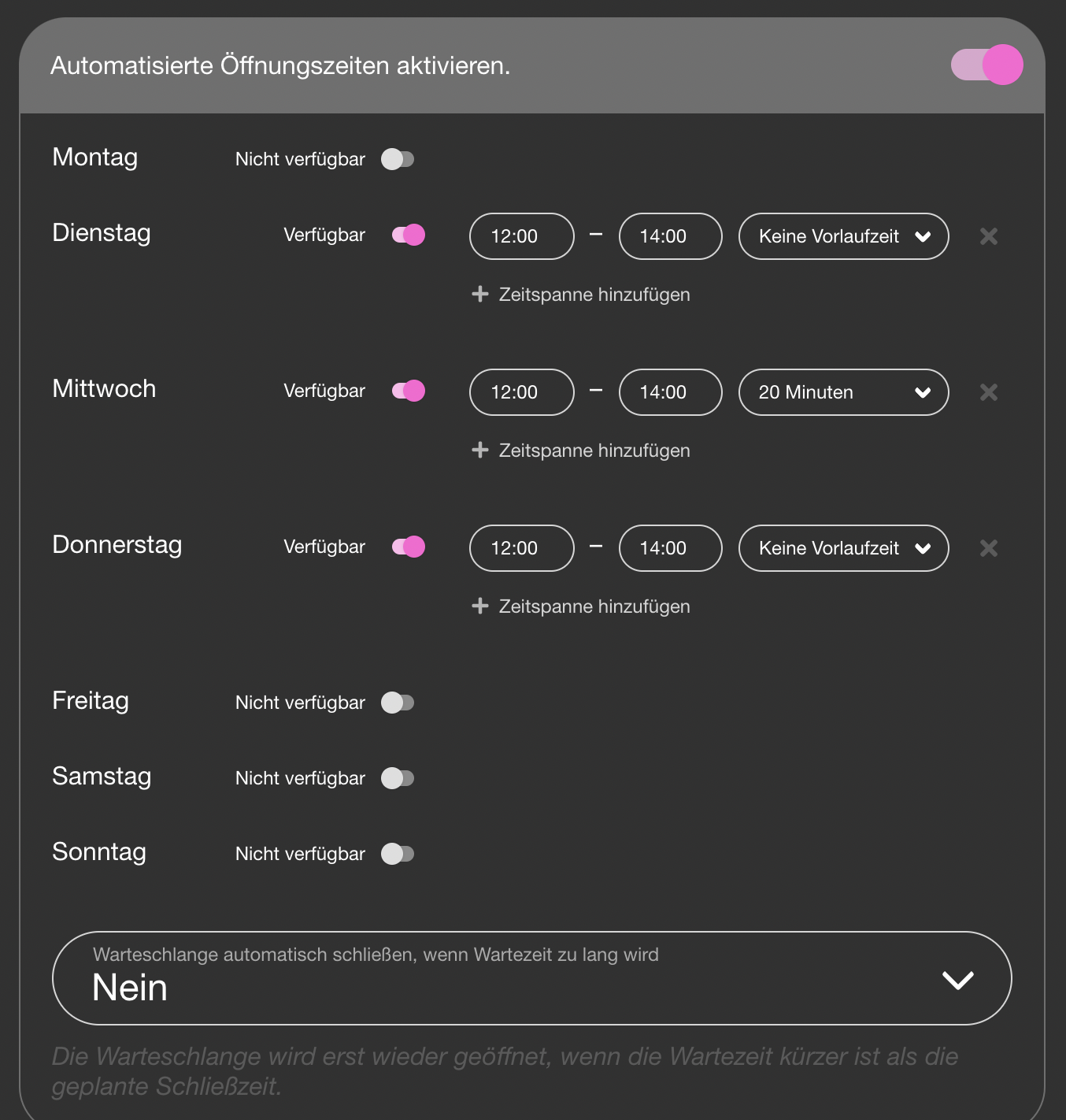 | 3 | ![]() | Opening hours settings | Shows weekly opening hours grid. UI likely changed. Recapture with realistic hours set. | |