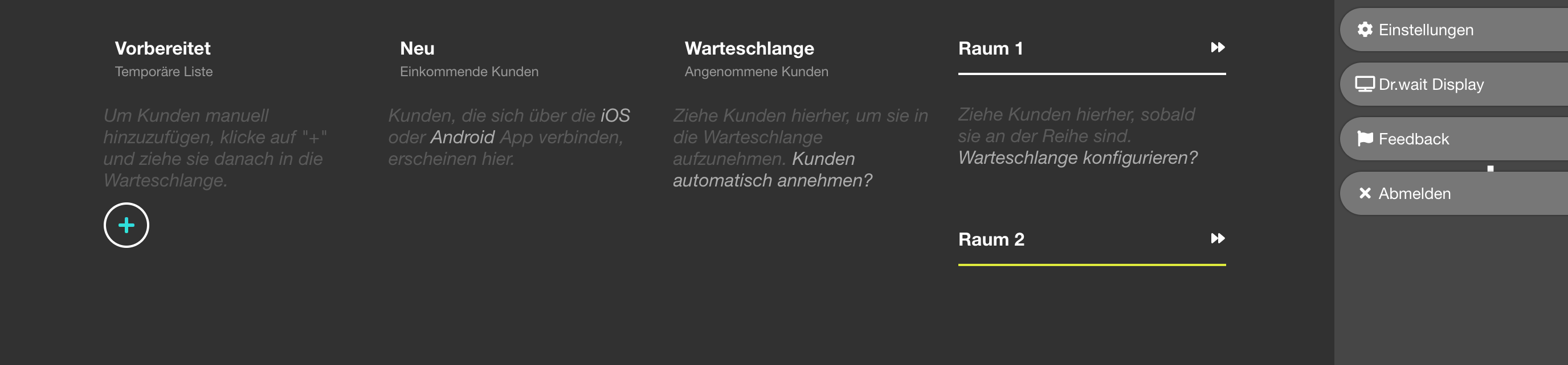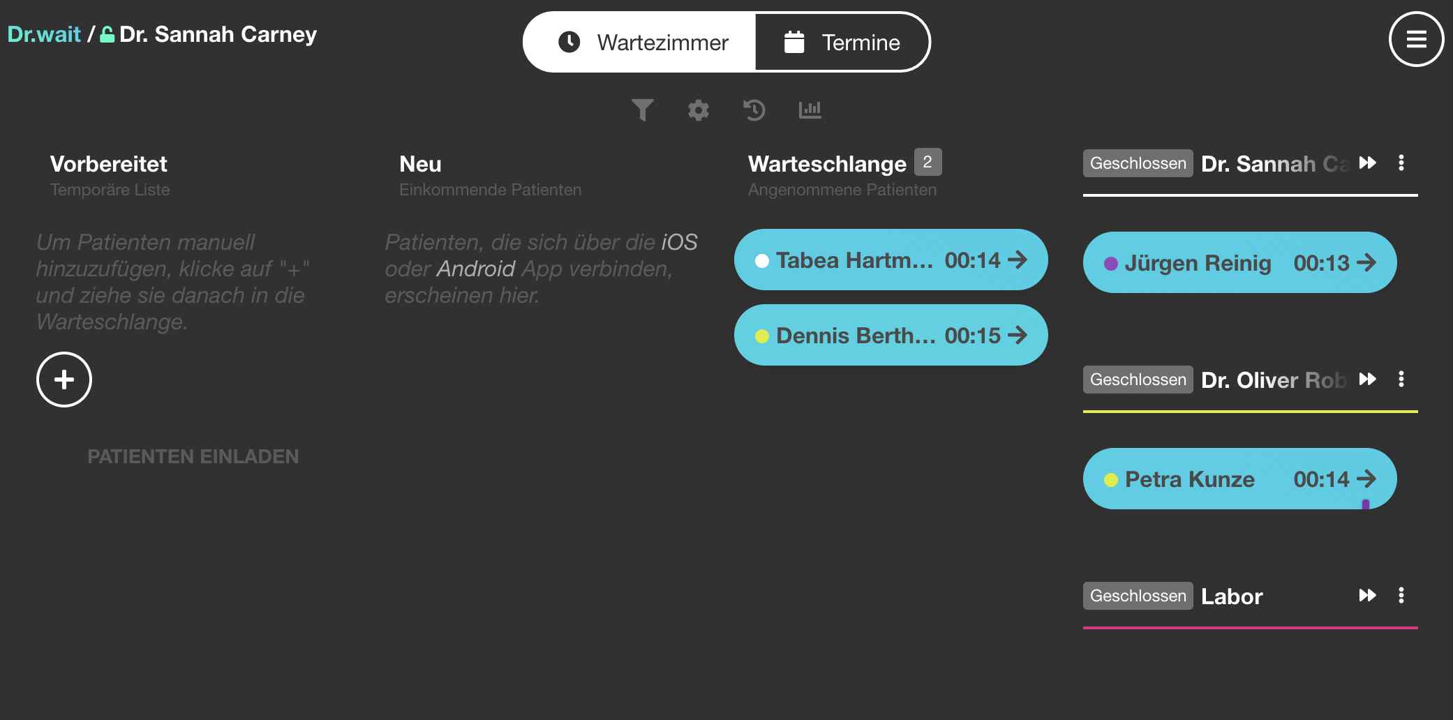 | 1 | ![]() | Wartezimmer-Manager overview | Core screenshot. Used on the main "Wie funktioniert Dr.wait" page. Shows the queue manager with patients — UI has been completely redesigned since 2021. Recapture with realistic test data (2-3 patients in queue). | |