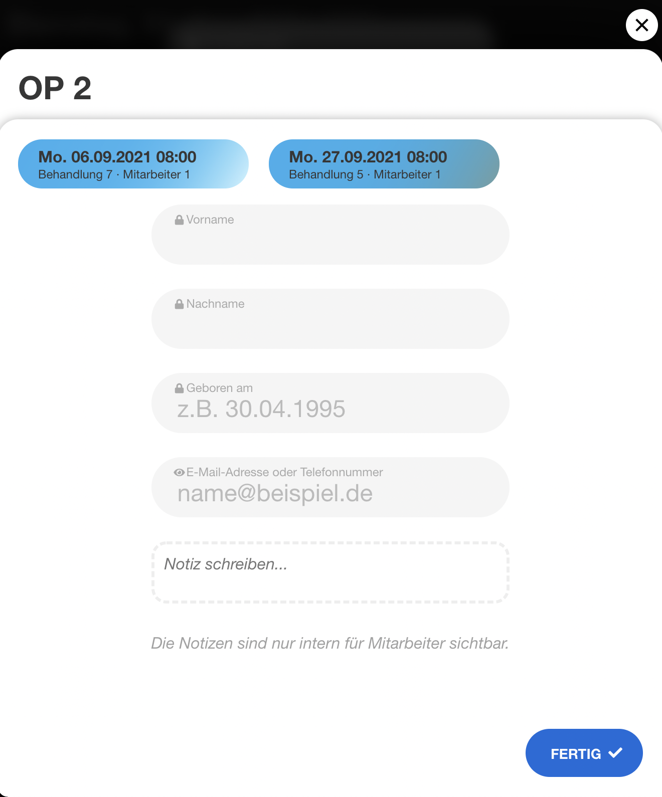 | 43 | ![]() | Using template — patient data | Patient data entry form when booking via template. Recapture. |