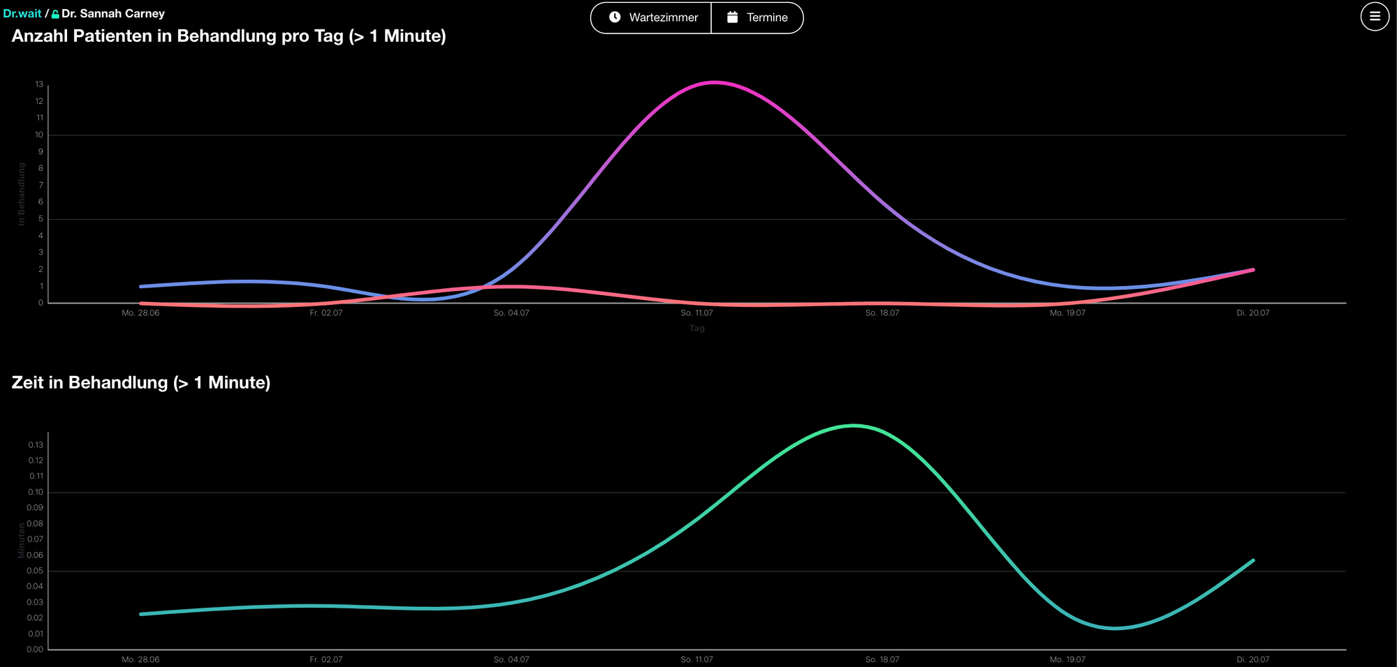 | 56 | ![]() | Waiting room statistics | Bar charts for patients/day and treatment duration. Recapture — verify chart library/style hasn't changed. | |