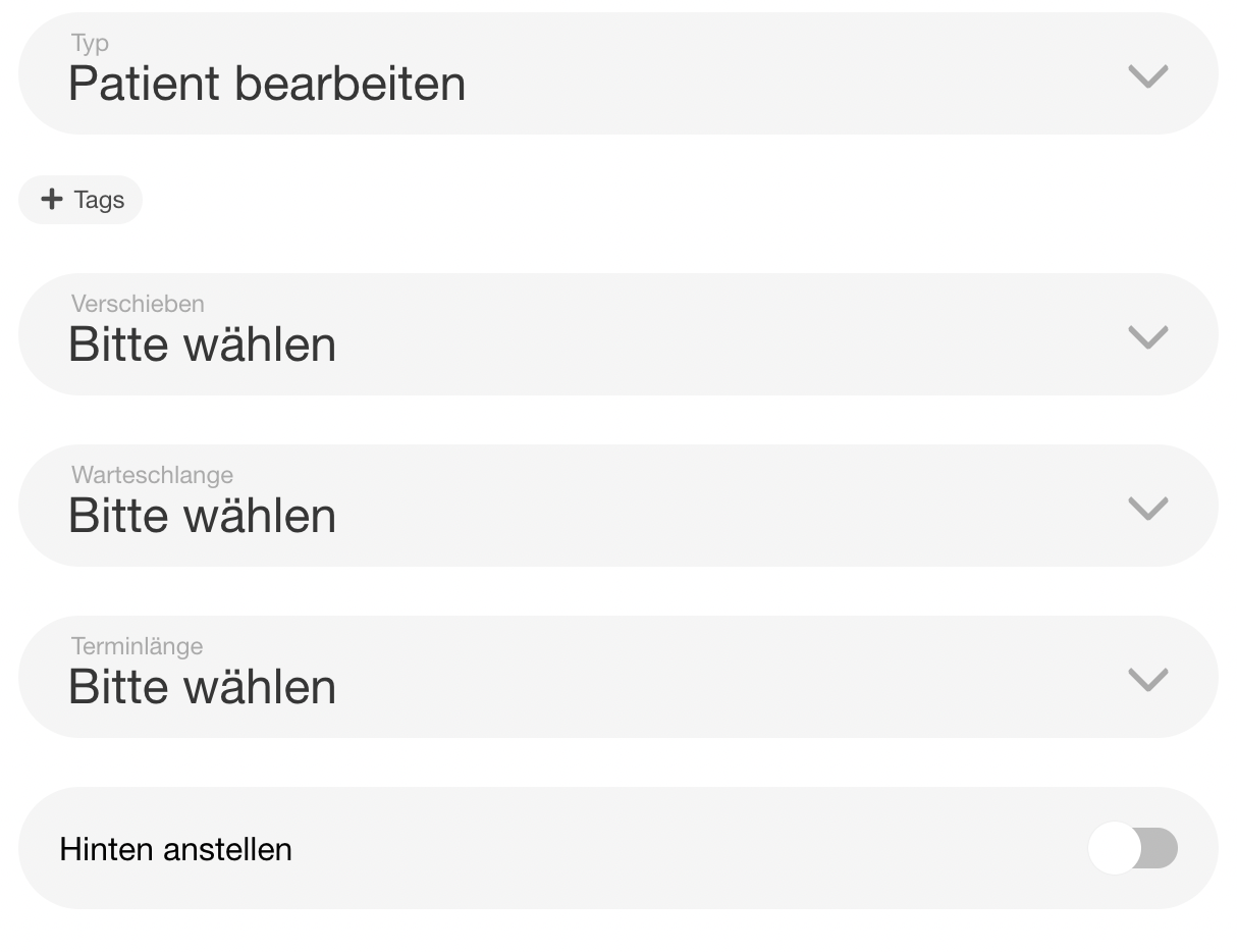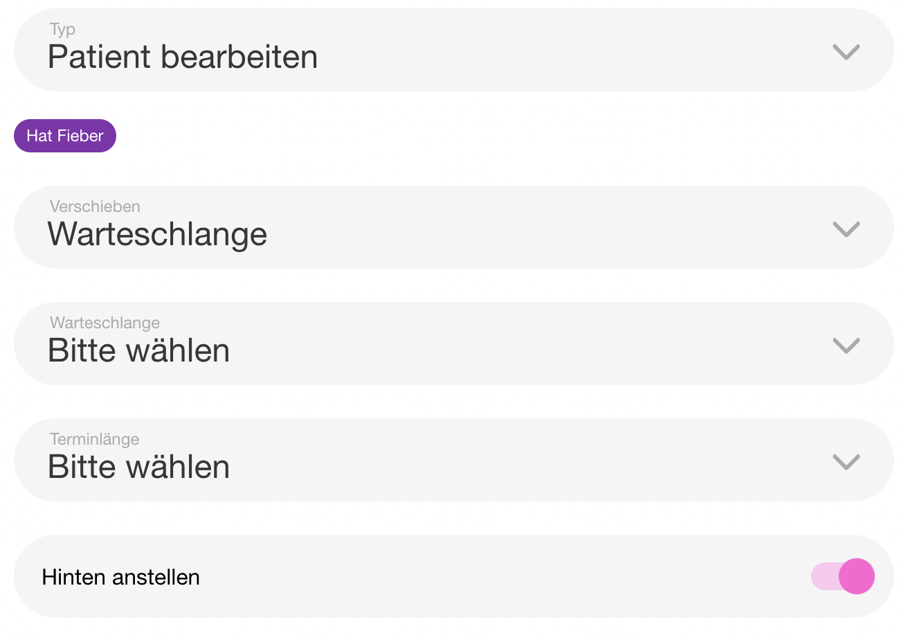| 5 | ![]() | "Always last" patient toggle | Shows patient detail panel with "Hinten anstellen" toggle. Recapture from patient detail view in queue manager. | |